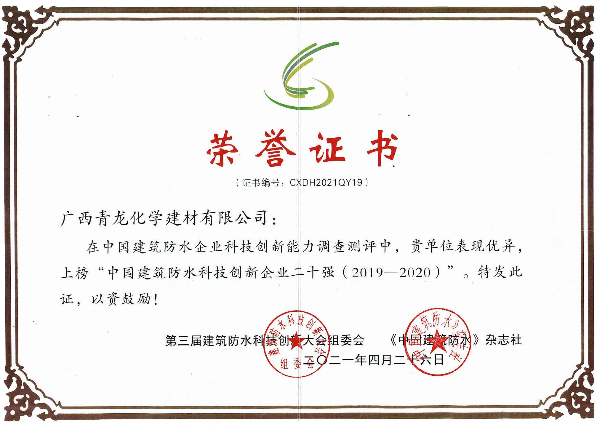 中國建筑防水科技創(chuàng)新企業(yè)二十強(2019-2020)