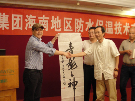 北京聯(lián)合大學(xué)易學(xué)與經(jīng)濟(jì)發(fā)展研究中心副主任、北師大易學(xué)文化講師游三林教授做“建筑學(xué)、居家與風(fēng)水”主題的演講,為現(xiàn)場(chǎng)的參會(huì)者解答疑惑。演講完畢后,游教授現(xiàn)場(chǎng)將一副名為“青龍之神”的毛筆字贈(zèng)與青龍集團(tuán)董事長(zhǎng)宋敦清。