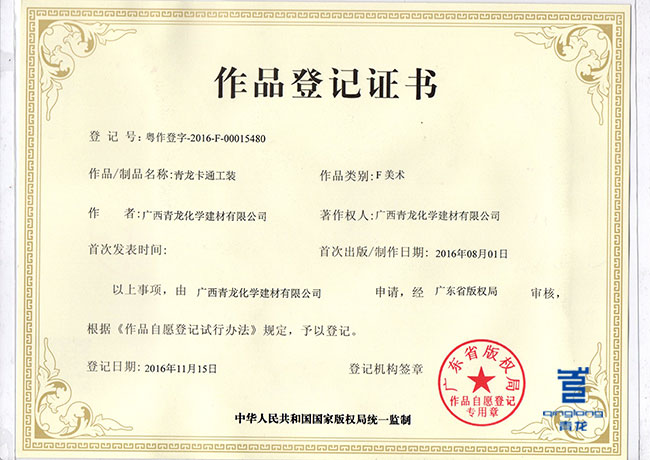 該證書的獲得,是青龍公司在知識版權(quán)工作上的又一個里程碑,它意味著青龍公司在具有獨立知識版權(quán)的防水行業(yè)得到了國家權(quán)威的認可和充分的肯定。