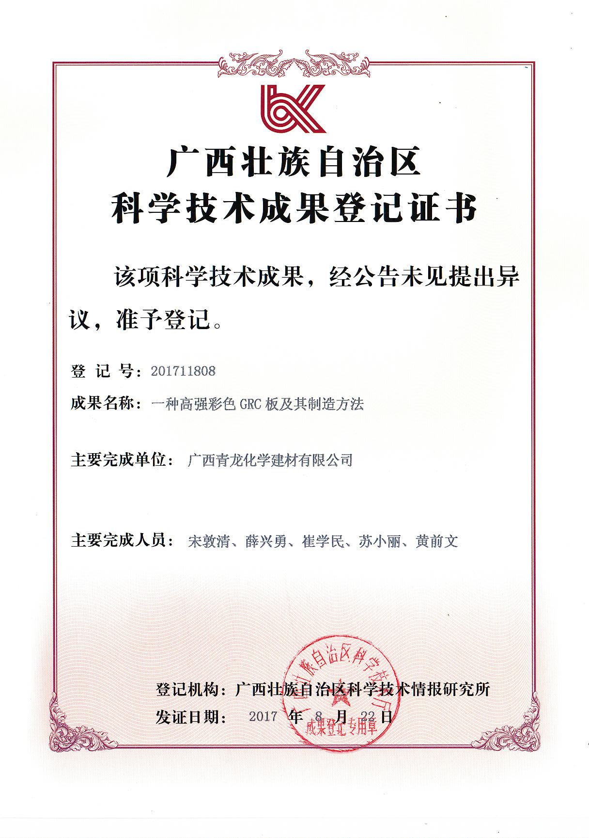 一種高強彩色GRC板及其制造方法科技證書