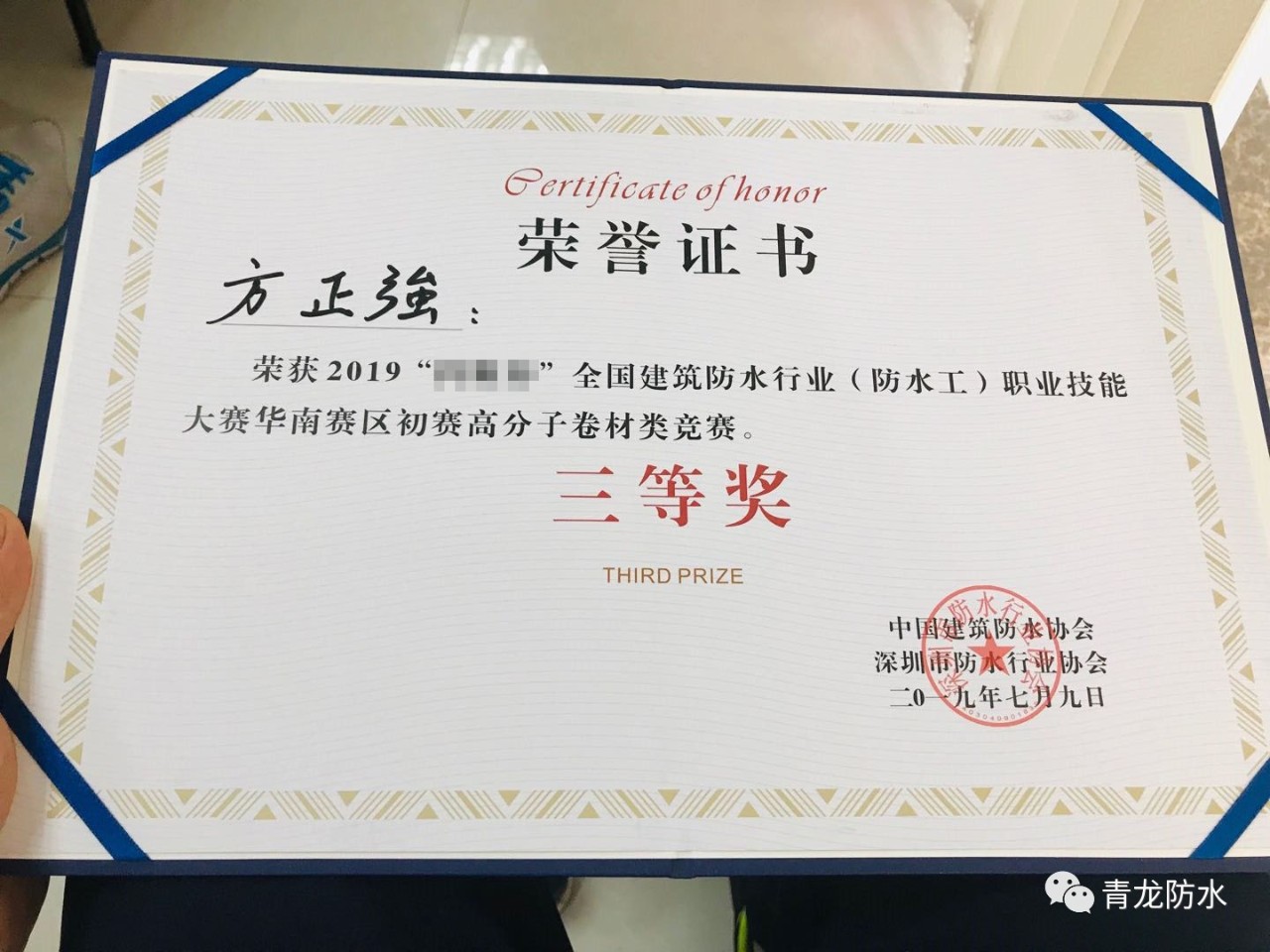 7月9日,由中國建筑防水協(xié)會、深圳市防水行業(yè)協(xié)會共同主辦的2019年全國建筑防水行業(yè)職業(yè)技能大賽(華南賽區(qū))初賽圓滿落幕,來自青龍公司工程部的方正強(qiáng)獲得全國建筑防水職業(yè)技能大賽三等獎的好成績。