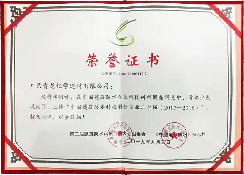 9月,第二屆建筑防水科技創(chuàng)新大會上,青龍司榮獲"中國建筑防水科技創(chuàng)新企業(yè)二十強(qiáng)",成為繼獲得首屆建筑防水科技創(chuàng)新大會"科技先鋒企業(yè)"和"科技先鋒人物"之后,青龍再獲"科技"類殊榮,彰顯了青龍公司強(qiáng)勁的科技創(chuàng)新實(shí)力和在行業(yè)的技術(shù)地位。