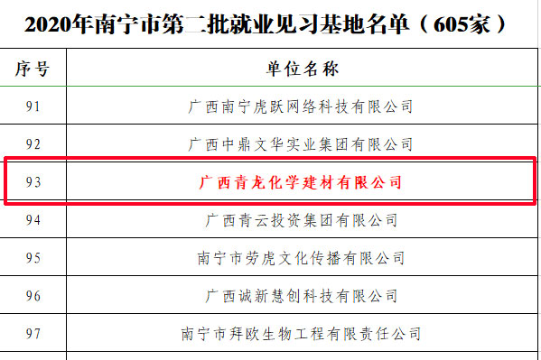 近日,從南寧市人力資源和社會保障局獲悉,為扎實推進高校畢業(yè)生就業(yè)見習(xí)工作,經(jīng)南寧市人力資源和社會保障局審核通過,我司廣西青龍化學(xué)建材有限公司被認為2020年~2022年南寧市就業(yè)見習(xí)基地。