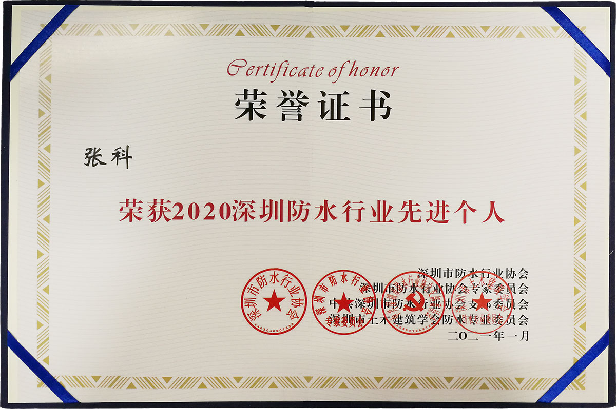 2021年1月9日,在深圳防水行業(yè)2020工作總結(jié)大會(huì)暨一屆五次會(huì)員大會(huì)(以線上視頻和線下會(huì)議方式召開(kāi))上,青龍防水補(bǔ)漏質(zhì)量總監(jiān)張科榮獲"2020深圳防水行業(yè)先進(jìn)個(gè)人"稱號(hào)。