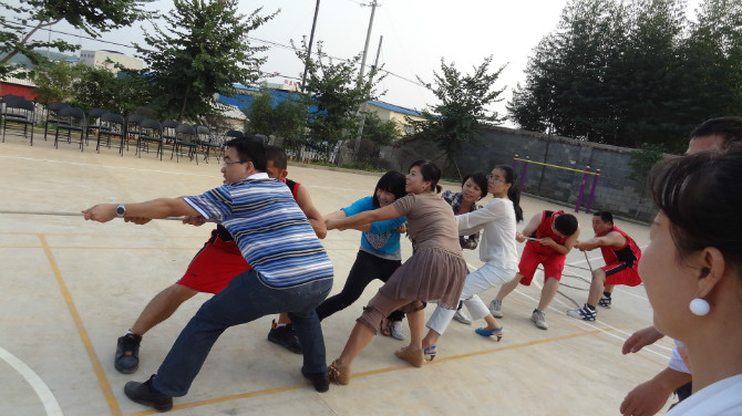 籃球賽后,雙方還進(jìn)行了激烈刺激的拔河比賽,雙方成員派出4男4女進(jìn)行拔河比賽,參賽隊(duì)員,啦啦隊(duì)、圍觀者人頭攢動(dòng),一派熱鬧的景象。隨著一聲哨響,兩邊隊(duì)員開始奮力向各自的方向拉,場(chǎng)外的啦啦隊(duì)們扯著嗓子吶喊助威,中間的紅色繩子開始搖擺,忽左忽右,僵持中,隊(duì)員臉上個(gè)個(gè)漲得通紅,經(jīng)過(guò)一番激烈的拉扯,紅繩之后到了金鷹隊(duì)這邊,勝利的喜悅彌漫了整個(gè)工廠的上空,不管是輸家還是贏家,大伙都玩得不亦樂(lè)乎。