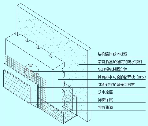 1、國外雙墻結(jié)構(gòu)比較多,外墻漏水會(huì)延著空腔往下流,由出水口流至外面;另外一種就是通過有排水功能的聚笨板將水排到地面。