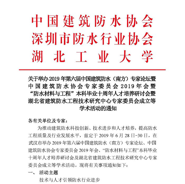 為推動建筑防水科技創(chuàng)新、技術進步和人才培養(yǎng),提高防水工程質量及行業(yè)發(fā)展水平,2019年6月28日-30日,第六屆中國建筑防水(南方)專家論壇、中國建筑防水協(xié)會專家委員會2019年會、"防水材料與工程"本科畢業(yè)十周年人才培養(yǎng)研討會及湖北省建筑防水工程技術研究中心專家委員會成立等學術活動,即將在武漢市舉行。