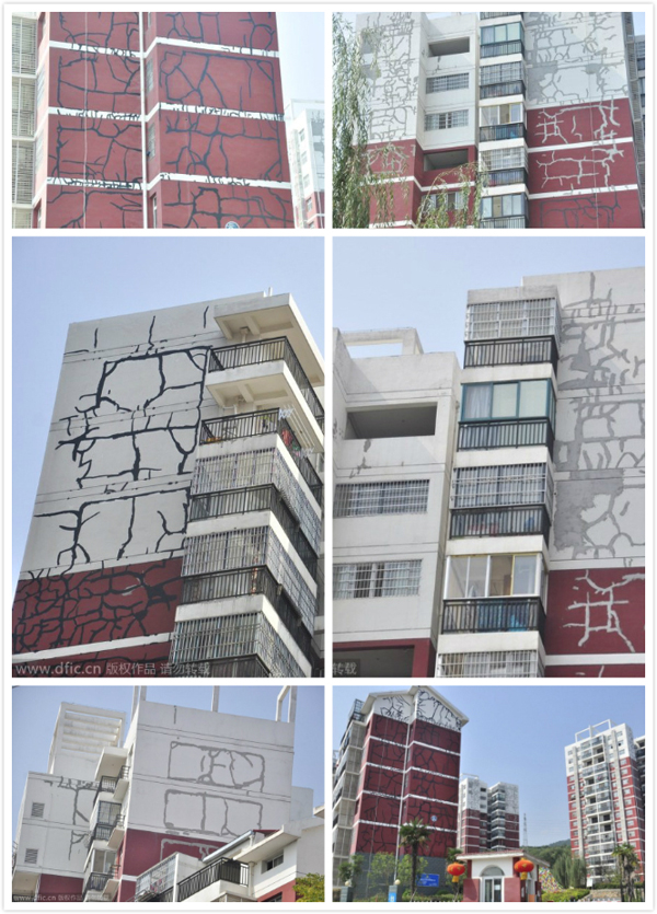 2014年10月10日,武漢市建成已經(jīng)三年的江夏區(qū)武昌大道某小區(qū),房屋外墻就出現(xiàn)不同程度的裂縫,于是有的樓棟側(cè)墻整面用黑色防水涂料涂成框框以防滲漏,從遠(yuǎn)處觀看,似乎給墻體綁上了“繃帶”。但是這樣的外墻“綁繃帶”真的能堵住滲漏嗎?
