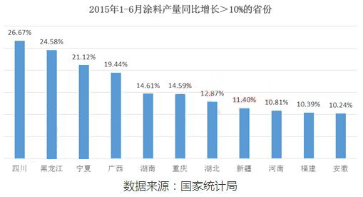 值得注意的是,中西部地區(qū)的防水涂料后勁十足,銷量大增。2015年上半年,四川省表現(xiàn)非常突出,其涂料總產(chǎn)量同比增長(zhǎng)高達(dá)26.67%,涂料產(chǎn)量達(dá)到了56.21萬(wàn)噸,位居第二梯隊(duì)之首,總排名第四。上半年四川省比去年同期增加涂料產(chǎn)量約15萬(wàn)噸,新增產(chǎn)量相當(dāng)于北京市上半年涂料總產(chǎn)量8.6萬(wàn)噸的1.74倍。排名第五和第六的分別為湖南49.20萬(wàn)噸、山東45.63萬(wàn)噸。下圖是2015年1-6月涂料產(chǎn)量同比增長(zhǎng)>10%的省份。